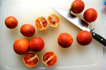 I learned this particular recipe in Fez, and quickly recreated it when we got home, obviously a good indicator of how much we enjoyed it the first time. Originally it was done with sweet large navel oranges, but this time I used some blood oranges intended for juicing. (Algerians take their oranges seriously, there are those for juicing, those for eating, those for cooking, etc.)